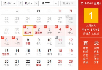 根據(jù)《國務(wù)院辦公廳關(guān)于2014年部分節(jié)假日安排的通知》精神,2014國慶節(jié)放假安排為:10月1日(星期三)至10月7日(星期二)放假調(diào)休,共7天。