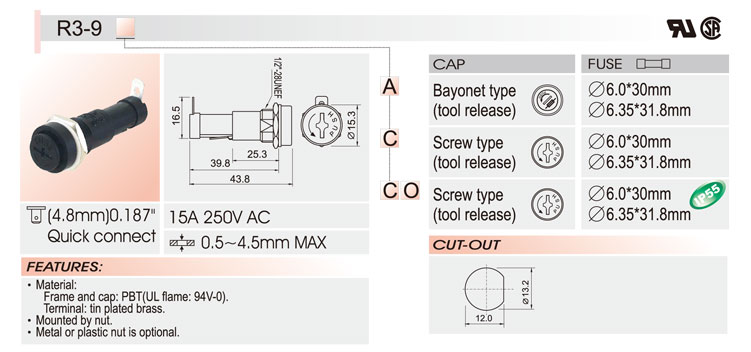 6*30面板安裝保險絲座 R3-9 UL CSA 15A250V