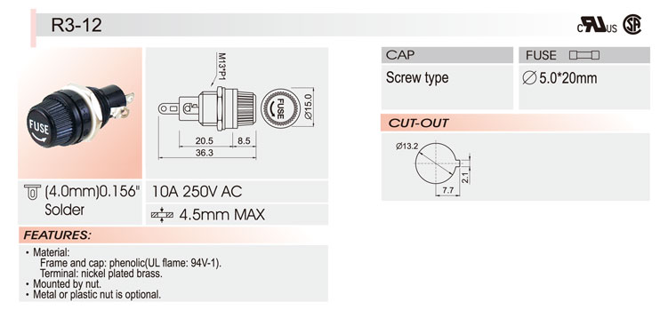 5*20 面板安裝保險絲座 R3-12 UL CSA 10A250V