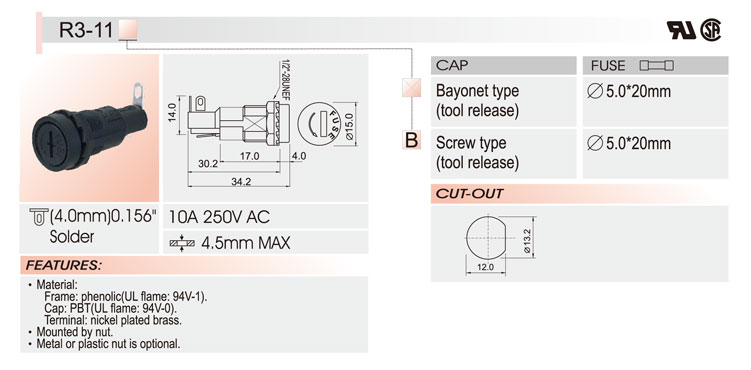 5*20面板安裝保險(xiǎn)絲座 R3-11 UL CSA 10A250V