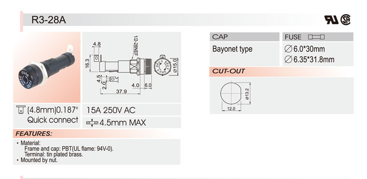 6*30 面板安裝保險(xiǎn)絲座 R3-28A UL CSA 15A250V
