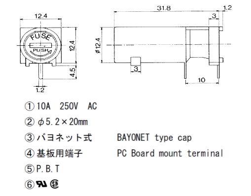 5*20 PCB板安裝保險(xiǎn)絲座 MF-561A UL CSA 10A250V