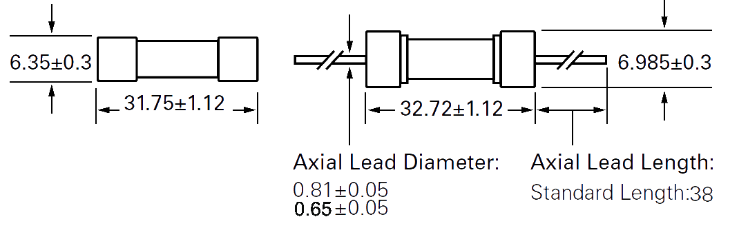 例子[example]: 6GTU 10A 125V/250V 1)系列號 Part Number 2)額定電流 Rated Current 1) 2) 3) 3)額定電壓 Rated Voltage 1-2 額定電流和額定電壓 Rated Current And Voltage 額定電流: 63mA~30A Rated Current: 63mA~30A 額定電壓:125V/250V AC Rated Voltage:125V250V AC 1-3標示Marking 保險絲上需有下列標示 The fuse shall have the following marking: 規(guī)格:特性符號+額定電流+額定電壓 Specification:Characteristic Symbol+Rated Voltage 63mA~800mA : _mA250V 1A~30A:_A250V Trade mark:The Manufacture’s Logo+Part Number+Approvals 63mA~30A: 注意:對標示字樣大小沒有規(guī)定 Note:Size of the markings have not be specified. 2.適用範圍 SCOPE 適用於車載電子設備。Used in car equipment. 3.工程圖和結構 OUTLINE DRAWING AND STRUCTURE 3-1 工程圖(單位:mm) Outline Drawing and Dimensions(Unit:mm)