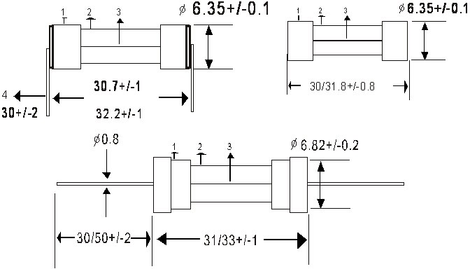 例子[example]: 6CHU 20A 1000V 1)系列號 Part Number 2)額定電流 Rated Current 1) 2) 3) 3)額定電壓 Rated Voltage 1-2 額定電流和額定電壓 Rated Current And Voltage 額定電流: 63mA~40A Rated Current: 63mA~40A 額定電壓:125V/250V/400V/500V/600V/1000V AC/DC Rated Voltage:125V/250V/400V/500V/600V/1000V AC/DC 1-3標(biāo)示Marking 保險絲上需有下列標(biāo)示 The fuse shall have the following marking: 規(guī)格:特性符號+額定電流+額定電壓 Specification:Characteristic Symbol+Rated Voltage 63mA~800mA : _mA1000V 1A~40A:_A1000V Trade mark:The Manufacture’s Logo+Part Number+Approvals 63mA~40A: 注意:對標(biāo)示字樣大小沒有規(guī)定 Note:Size of the markings have not be specified. 2.適用範(fàn)圍 SCOPE 適用於一般電子設(shè)備。Used in electronic equipment. 3.工程圖和結(jié)構(gòu) OUTLINE DRAWING AND STRUCTURE 3-1 工程圖(單位:mm) Outline Drawing and Dimensions(Unit:mm)