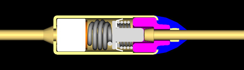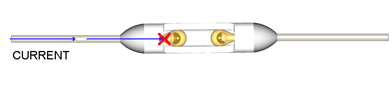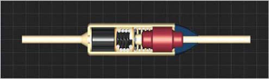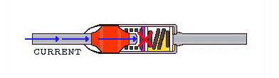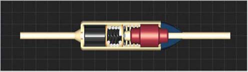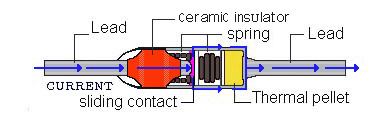 -SW-1.3.5 系列溫度保險絲由可動觸點(sliding contact)、 彈簧(spring)、可熔體(electrically nonconductive thermal pellet)構(gòu)成。在溫度保險絲啟動之前電流從左側(cè)引線流向可動觸點(sliding contact),通過金屬外殼向右側(cè)引線流動。在外部溫度達(dá)到預(yù)定溫度時可熔體熔化,壓縮彈簧會變松。即彈簧膨脹,可動觸點(slidingcontact)與左側(cè)引線分離?;芈繁淮蜷_,可動觸點(sliding contact)與左側(cè)引線間電流被切斷。