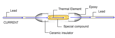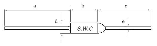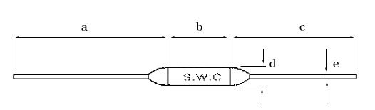 -SW-2 系列溫度保險絲由軸對稱的引線(leed )、在規(guī)定溫度下可熔化的金屬化合物可熔體(thermal element)及為防止其熔化氧化的特殊混合物(special compound)和絕緣容器(ceramic insulator)構(gòu)成。周圍溫度上升時特定的樹脂混合物開始液化, 當(dāng)達(dá)到熔點時樹脂混合物熔化產(chǎn)生表面張力作用,之后連接兩個引線的金屬化合物熔化移向引線,從而永久切斷回路。