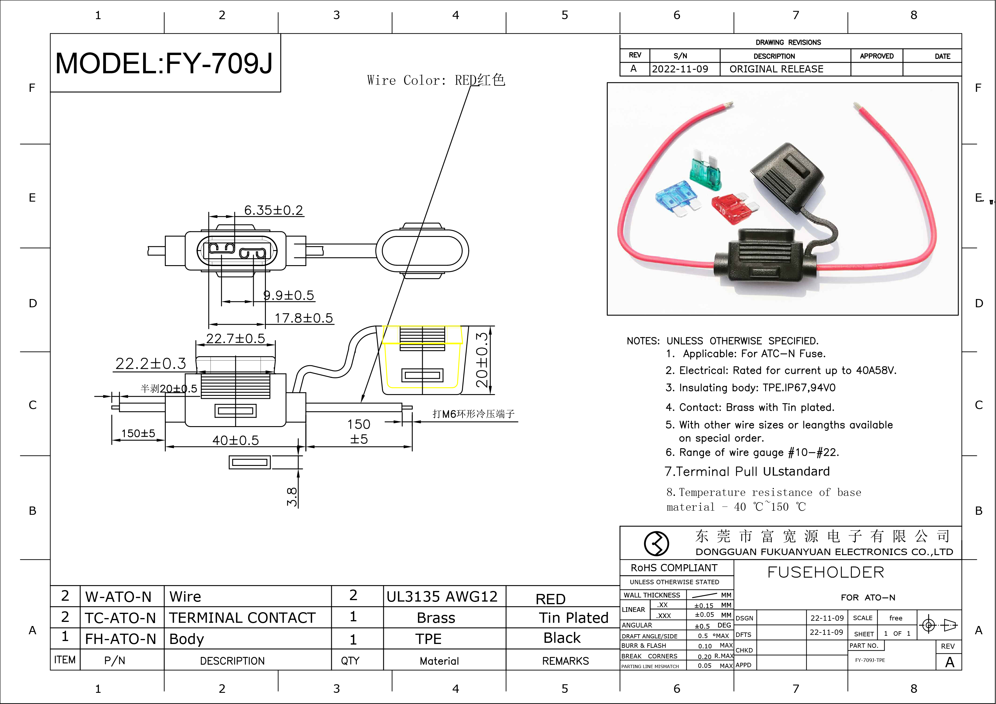 3 、連接線:(Cable)1015 type 10 -22AWG 600v,紅色線,兩端各外露 150mm 長。1015 type 10-22AWG 600v , The red line is 150mm long with both ends exposed.